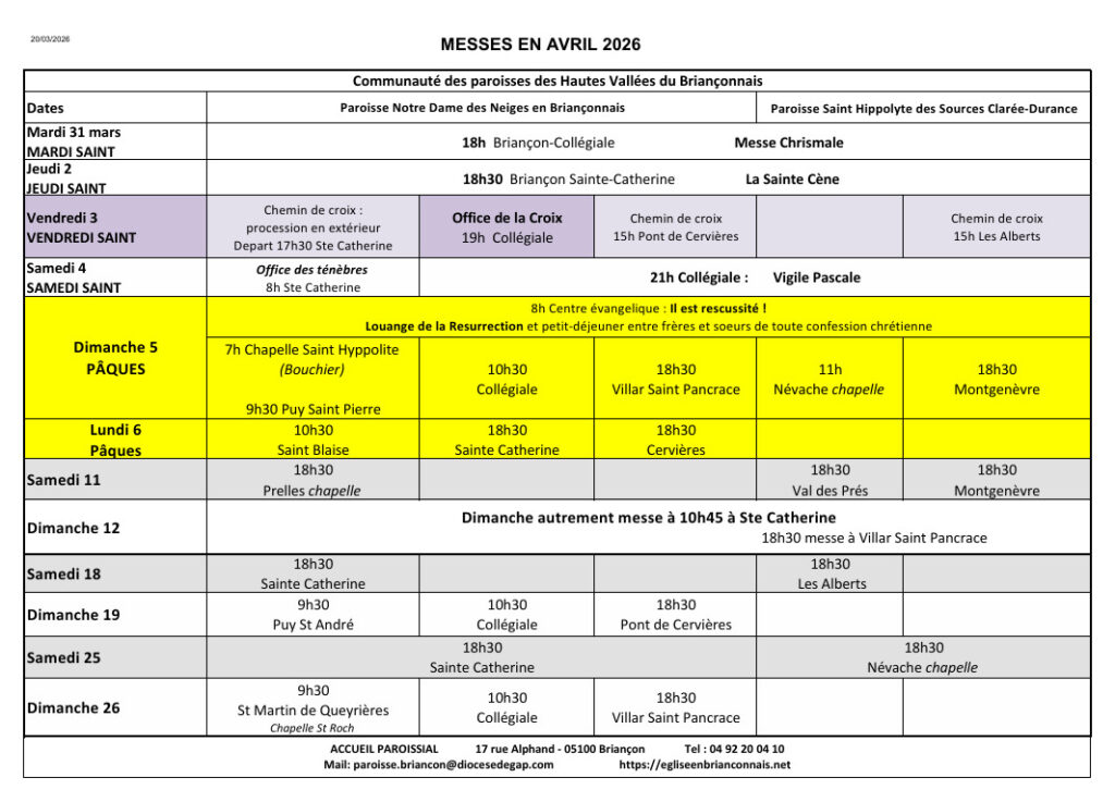 Messes en Avril 2026 dans le Briançonnais : Télécharger